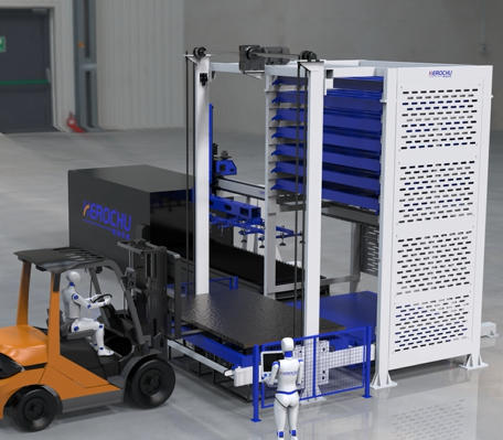 Además, el diseño de carga integrada minimiza las piezas móviles. Los sistemas convencionales requieren transportadores independientes, mesas elevadoras y rodillos de alineación, cada uno con su propio programa de mantenimiento. Herochu utiliza un solo accionamiento por cadena para el movimiento vertical y una horquilla telescópica para la transferencia horizontal. Menos componentes significan un menor tiempo medio entre fallos y diagnósticos más rápidos accesibles vía VPN remota.