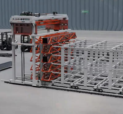 El robot de pórtico de carga merece una atención especial porque es el elemento más dinámico. Su estructura es un pórtico tipo puente fabricado con celosías de acero de alta resistencia. El diseño de celosía minimiza el peso mientras maximiza la rigidez —esencial para la precisión de posicionamiento bajo cargas variables. El robot se desplaza sobre guías lineales montadas en el piso o en vigas elevadas, dependiendo de la configuración del almacén. La longitud de desplazamiento puede superar los 30 metros en instalaciones grandes. Los tres ejes (desplazamiento horizontal, elevación vertical y extensión de horquillas) son servo-controlados y sincronizados para permitir trayectorias de movimiento coordinadas.